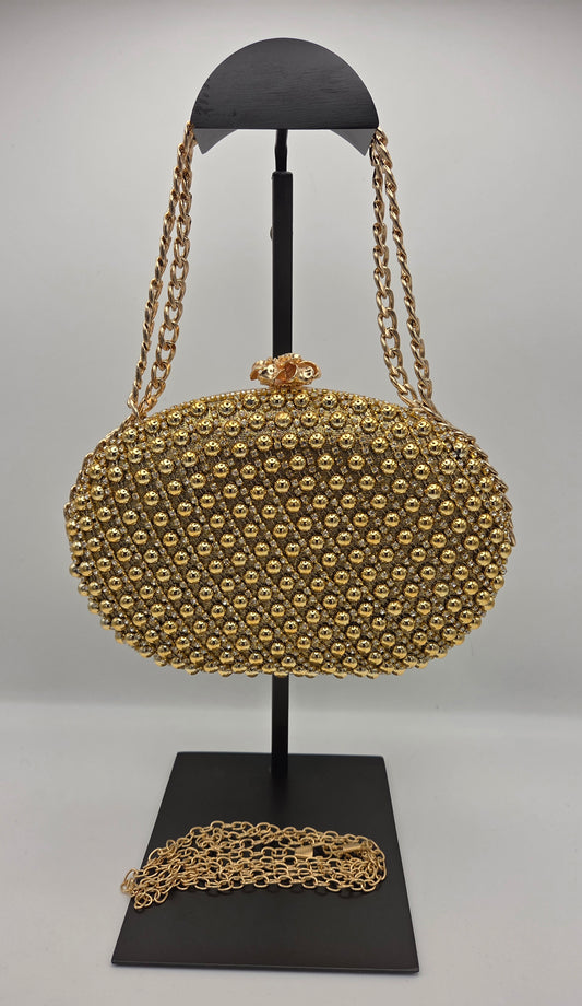 Evening bag clutch, Polyester fabric, push lock closure with detachable shoulder strap. Gold/Silver hardware. L...