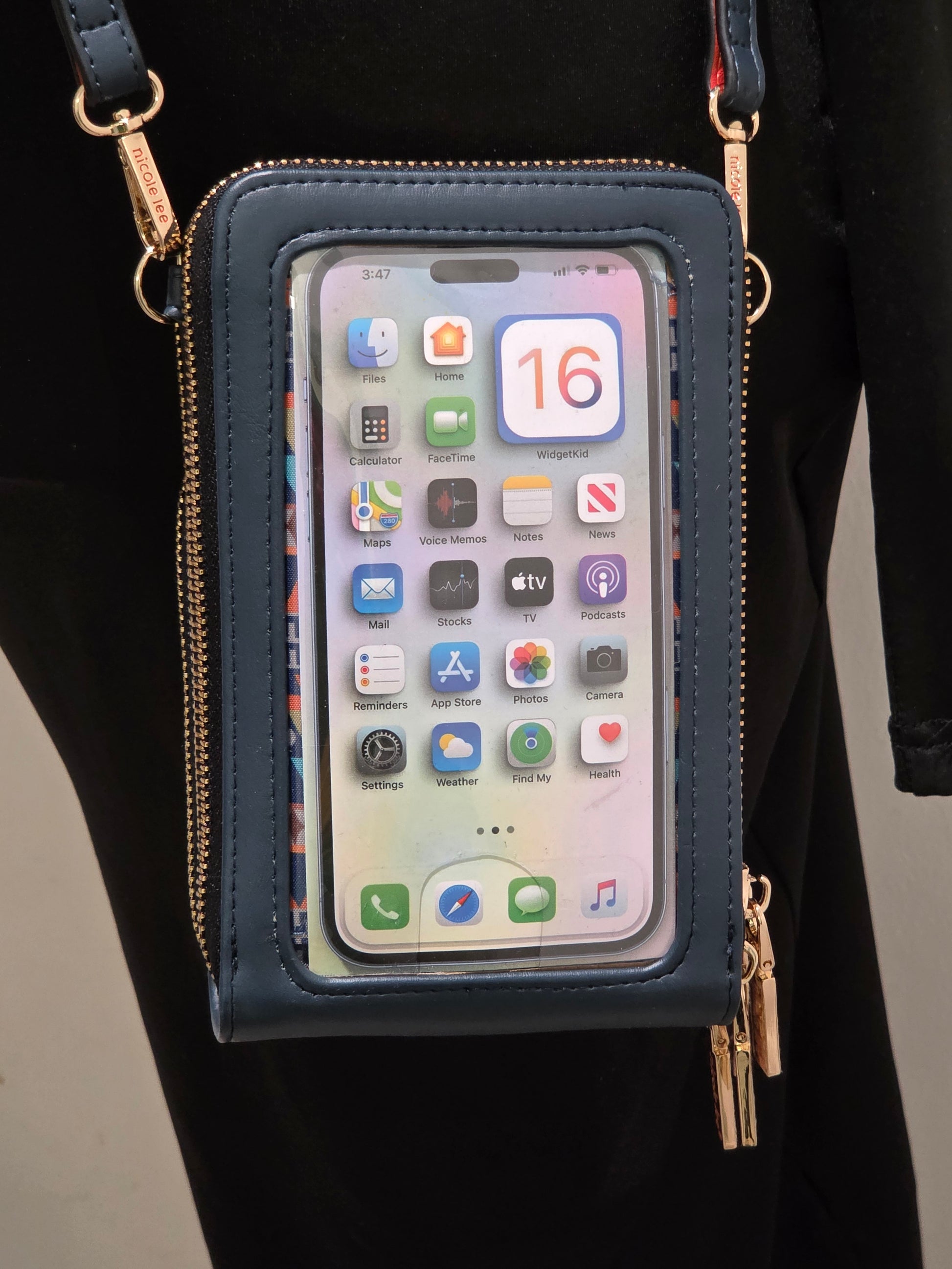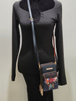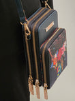 Vegan leather exterior. 2 Main zip compartments with 2 way zip closure. Front zip compartment. Universal phone size compartment on back. Side D-rings for optional crossbody strap. 8 interior card slots and adjustable crossbody strap.
